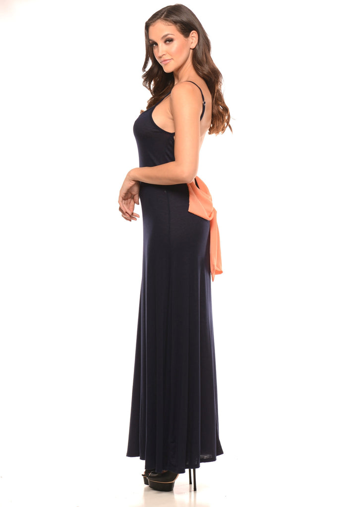 Style to the max! Get this beautiful maxi, with adjustable spaghetti straps and deep cut back with coral bow.